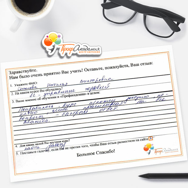 Понравилось. Курс обучения 1С Управление торговлей изложен доступно, понятно, цена приемлемая. На все вопросы - быстрый ответ. Спасибо.
