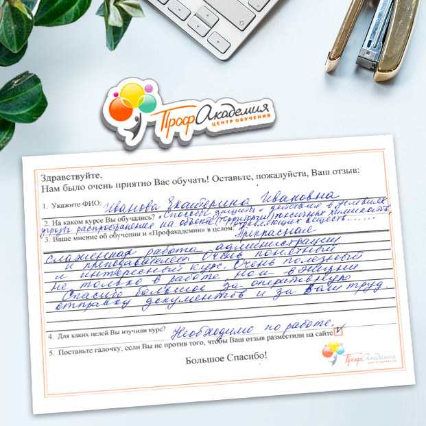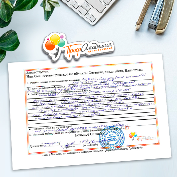 Слаженная работа администрации и преподавателей. Очень понятный и интересный курс. Очень полезный не только в работе, но и в жизни. Спасибо большое за оперативную отправку документов и за Ваш труд.